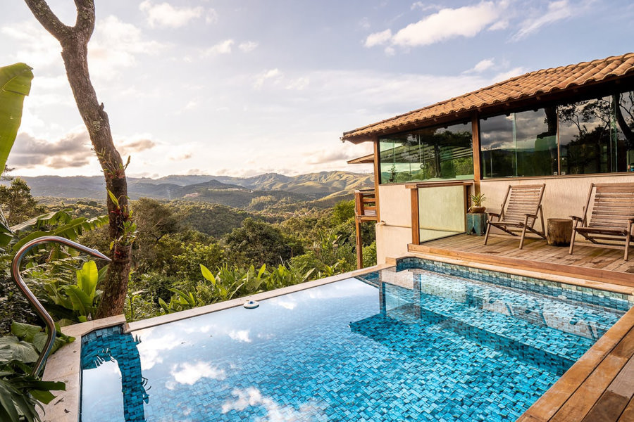 Com vista para a serra e muito verde, a casa é preparada para receber ensaios fotográficos e tem bastante opção de cenário incluindo um ambiente no estilo pub com uma pegada rock and roll e até mesa de sinuca. Há também piscina, hidromassagem e uma rede enorme para fotos diferenciadas.